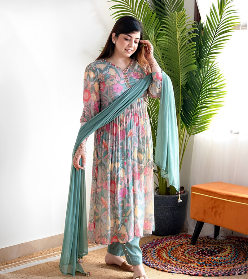 Upgrade your ethnic wardrobe with our stunning collection of designer suit sets. Whether you love the grace of Anarkali suits, the comfort of cotton sets, or the flair of shararas and palazzos – we've got something just for you!