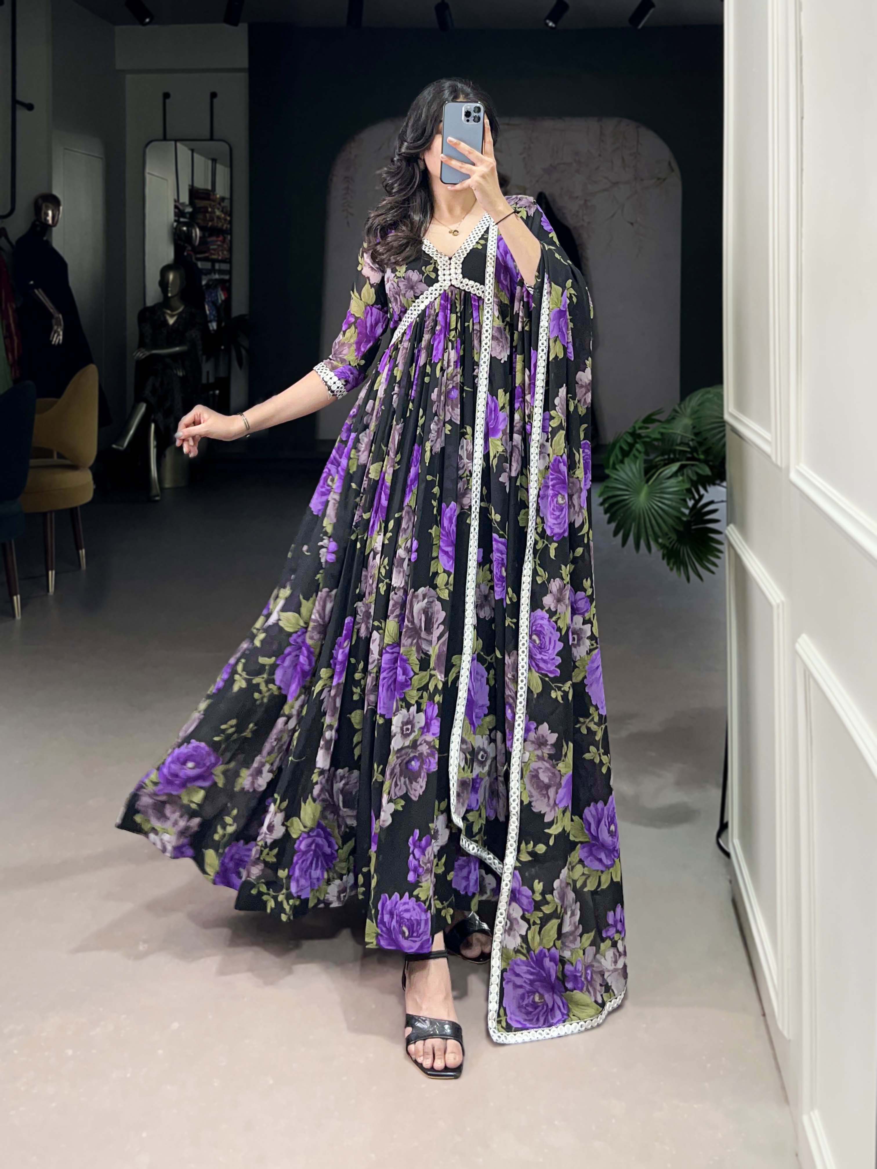 Black And Purple Color Floral Printed Georgette Gown