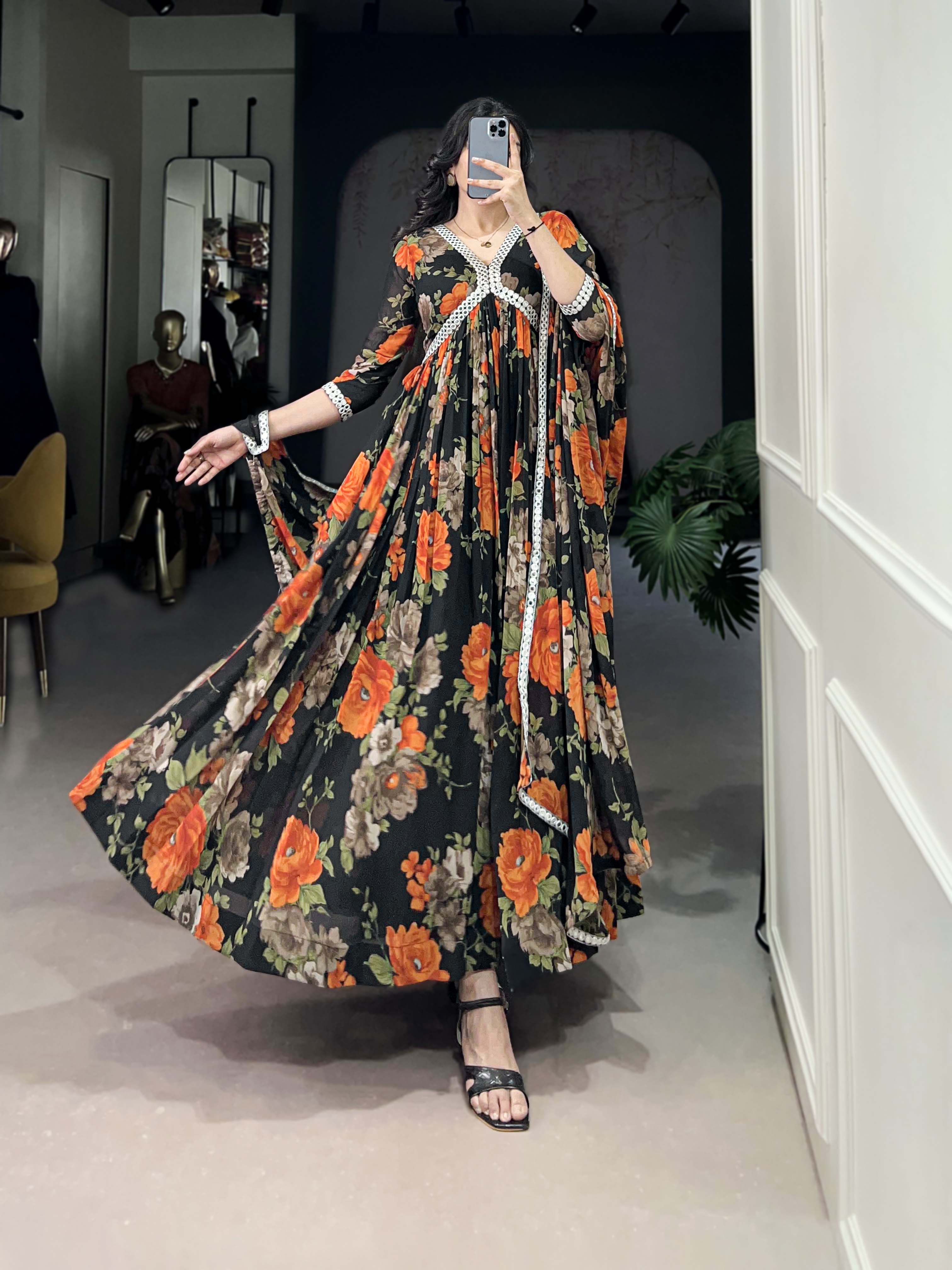 Work: Beautiful Floral Print with Paper Mirror Lace Touch